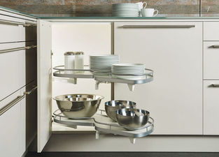Functional revolving shelves, can simply be pulled out in front of the cabinet. The corner unit solution that combines optimum space utilisation with an outstandingly clear arrangement. All levels can be moved independently of each other.
